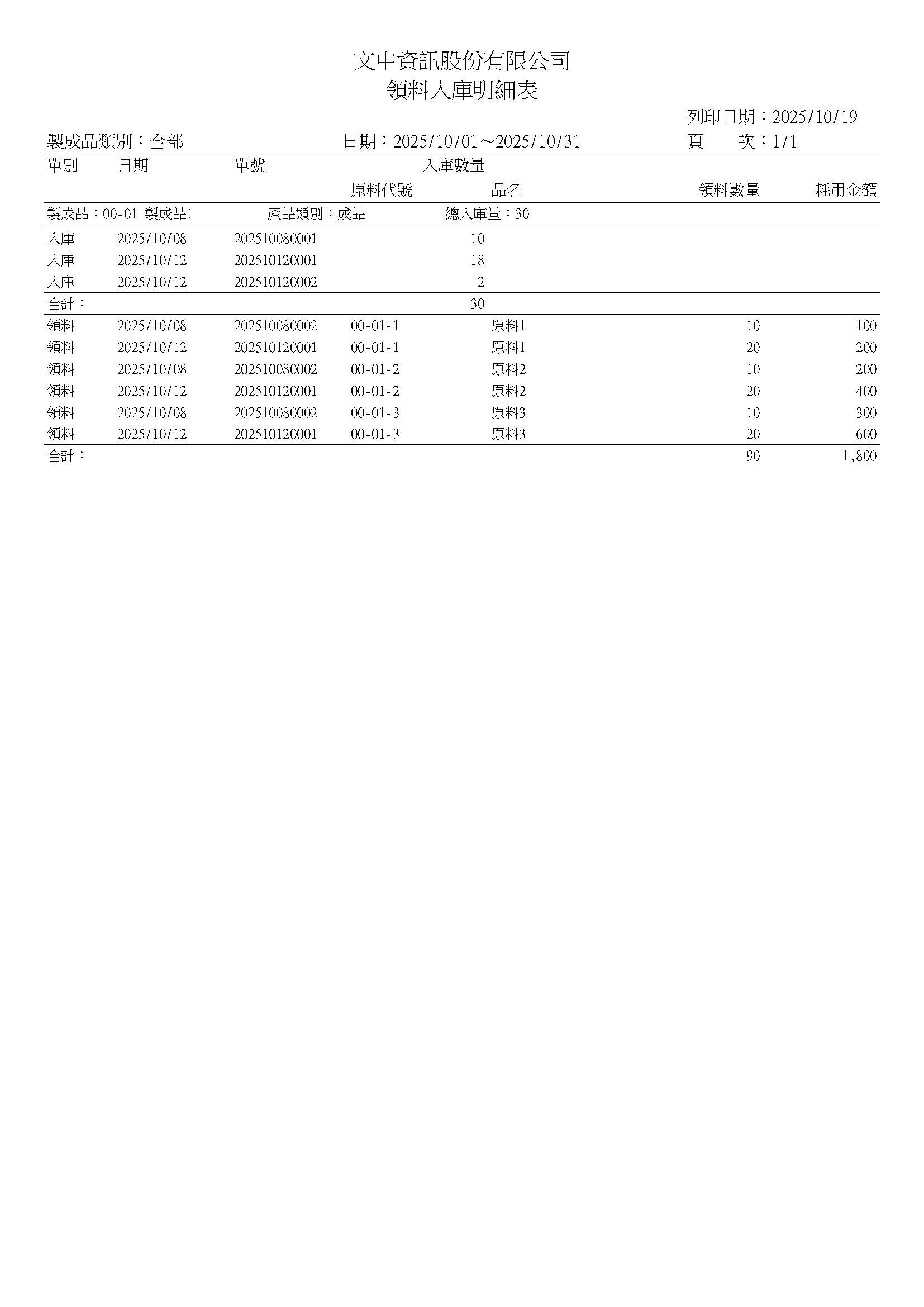領料入庫明細表